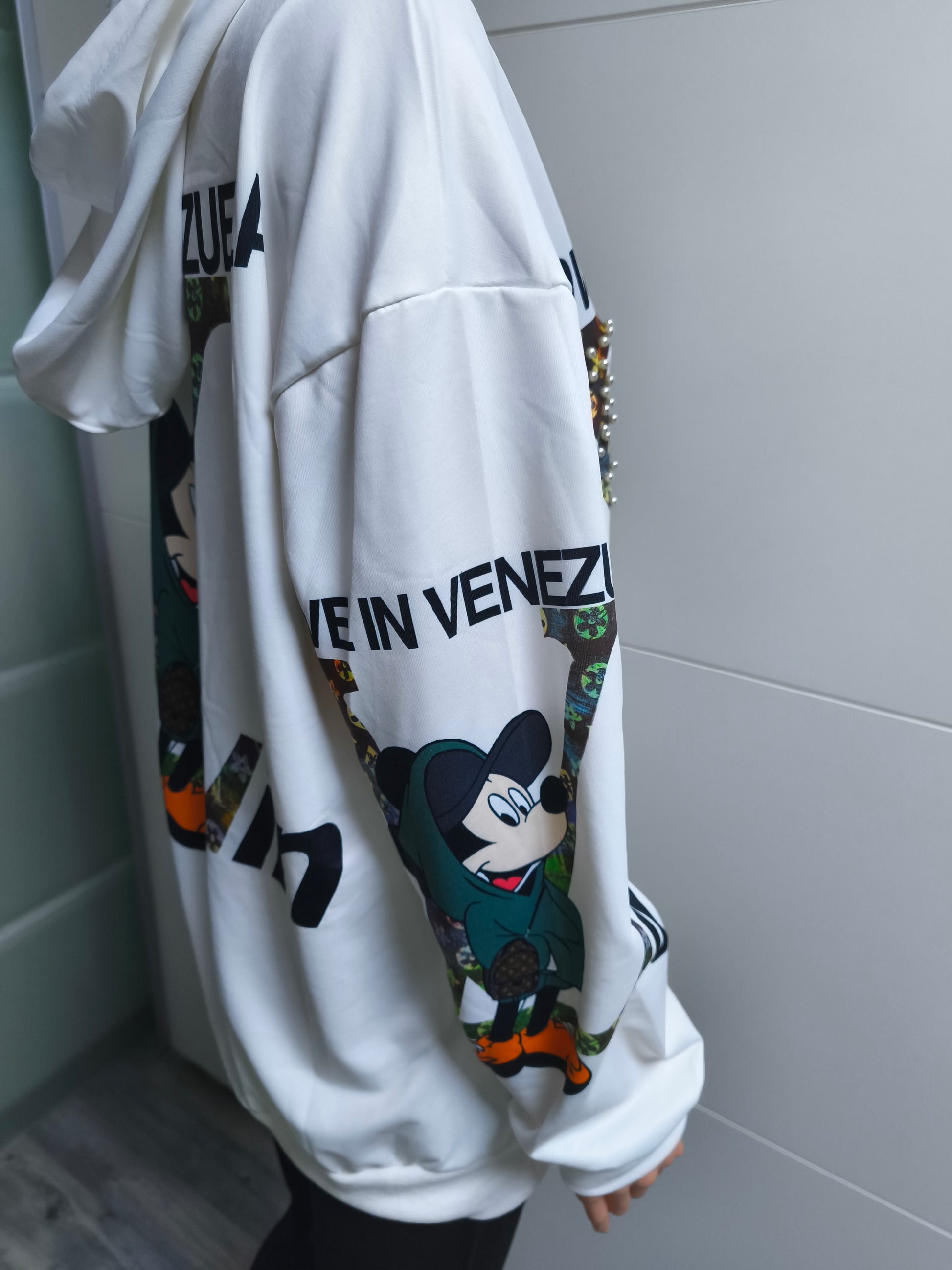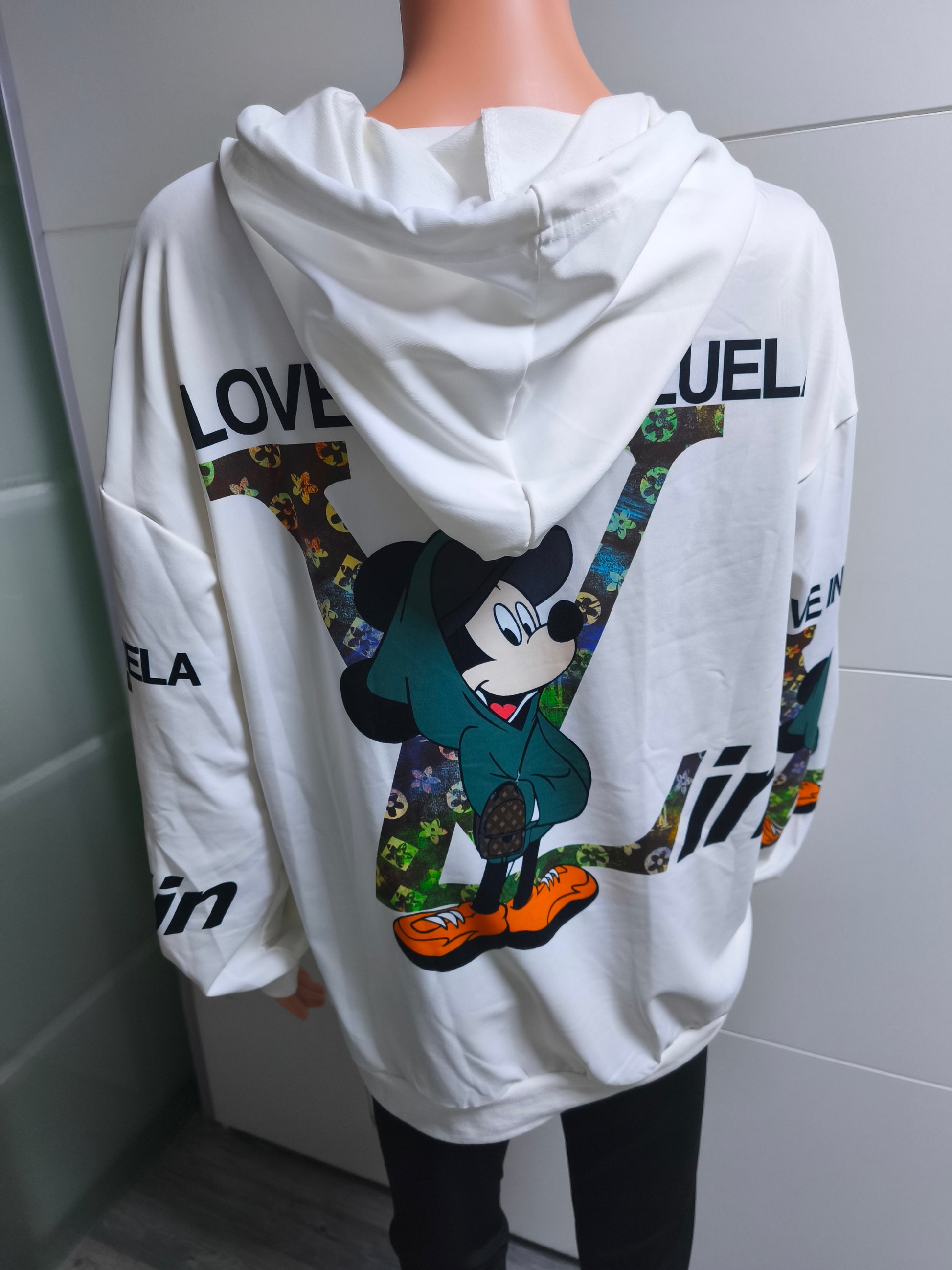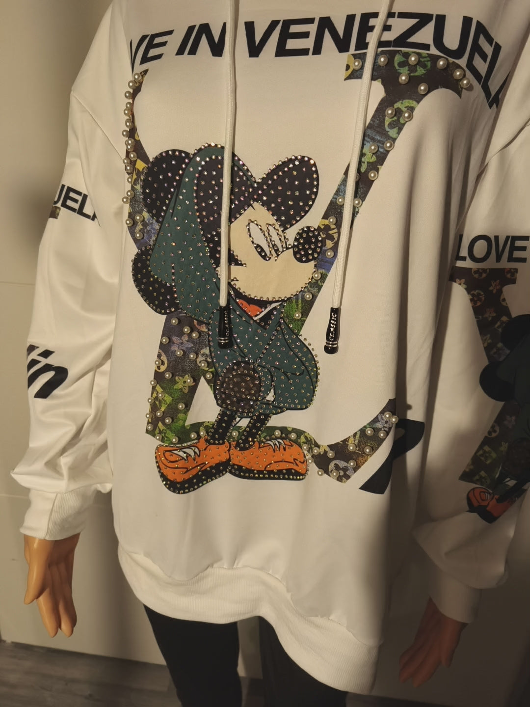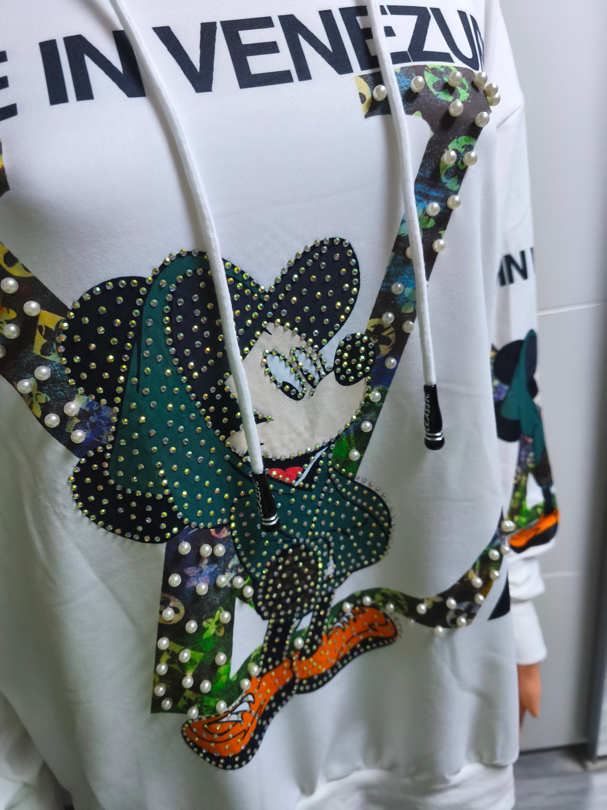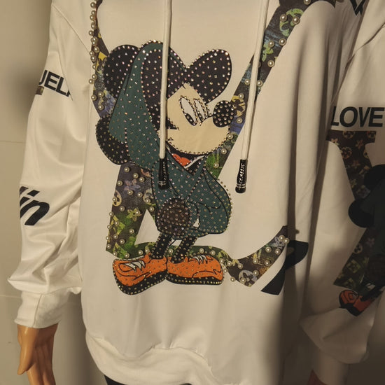 LV angelehntes Shirt mit Kapuze und Druck auf Arme und beiden Seiten. Vorn mit Perlen und Strasssteinen versehen. Das Shirt ist locker bis Größe 44 tragbar.