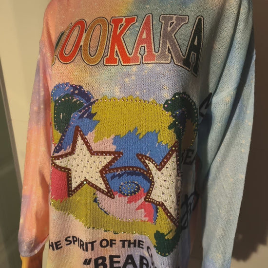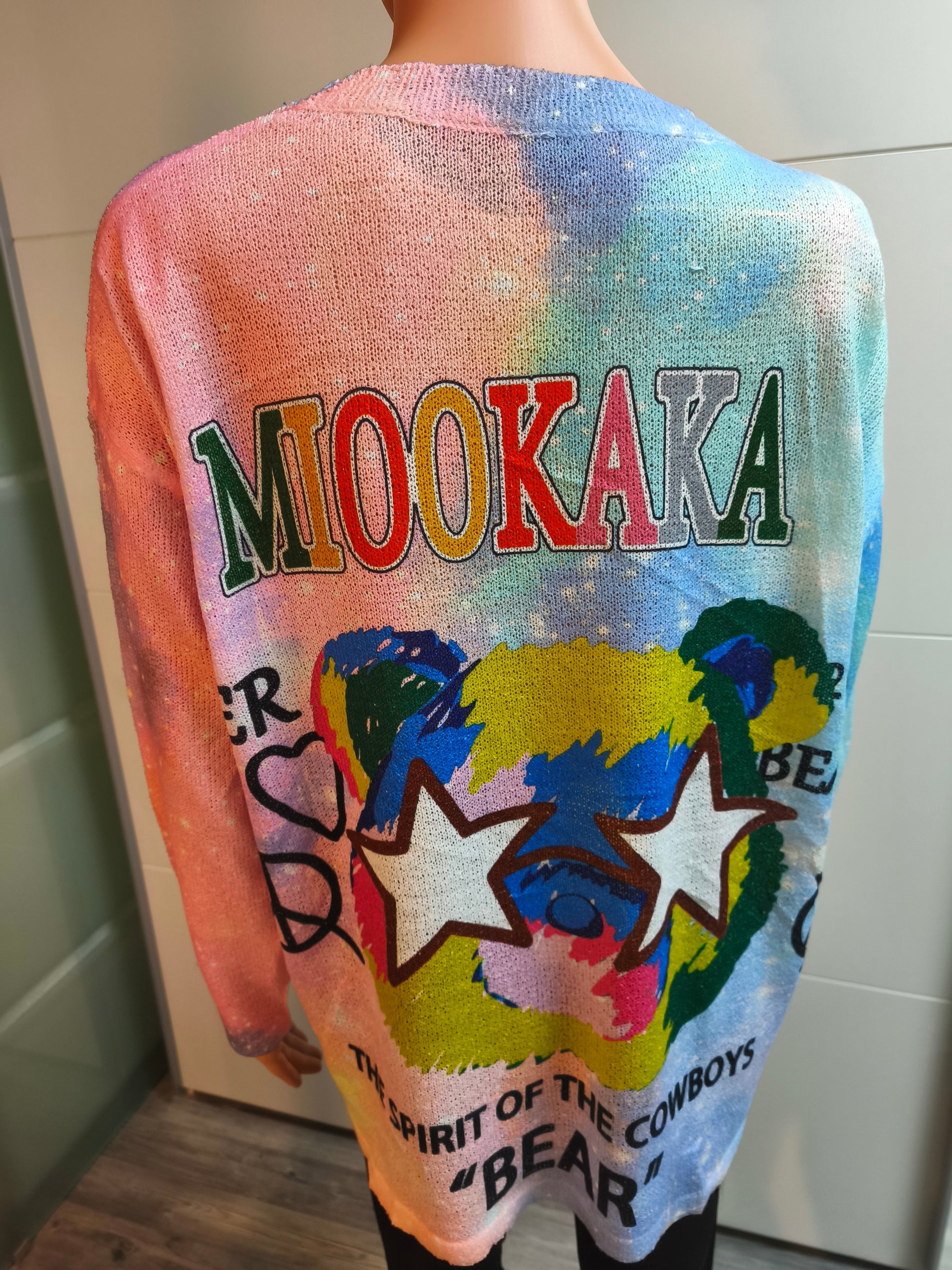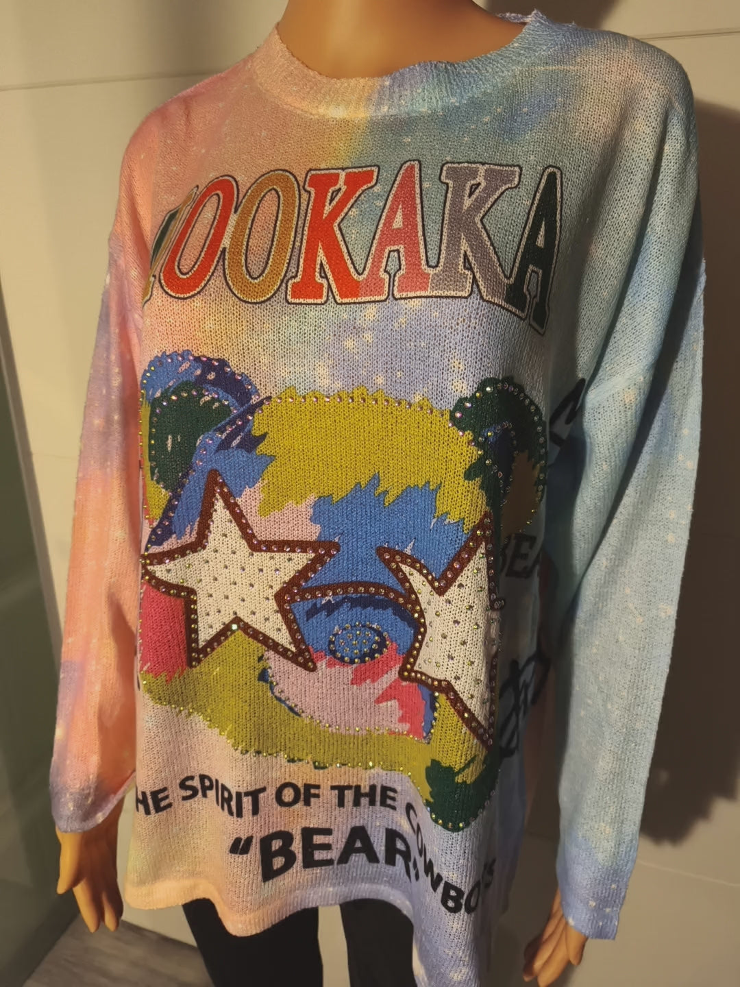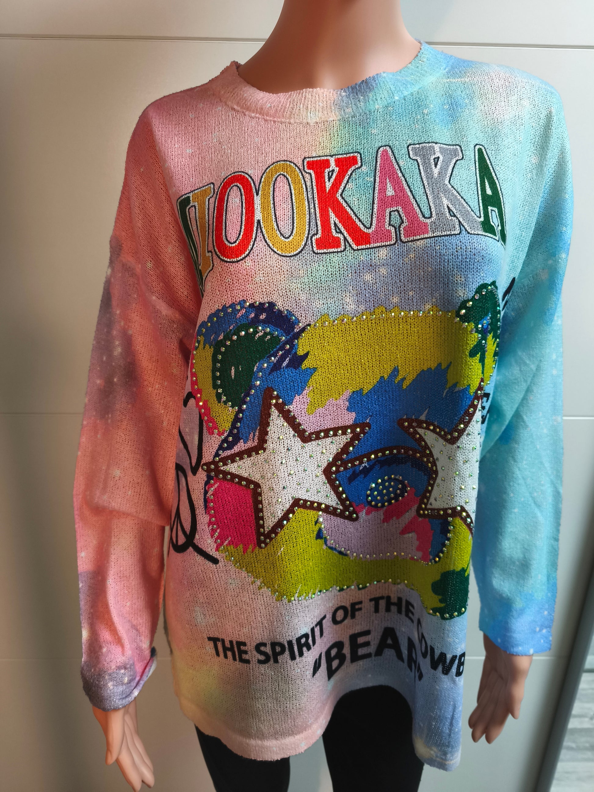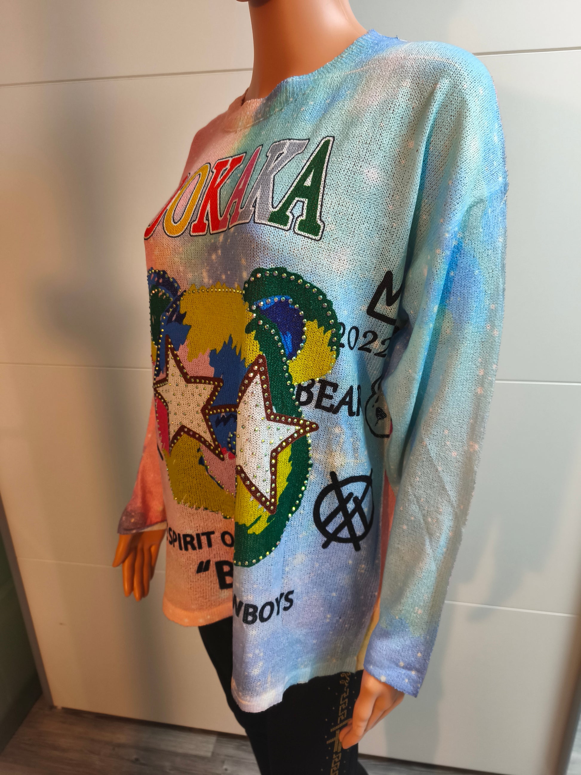 Farbenfroher Feinstrick Pullover mit großen Glitzersteinen vorn und Druck um den gesamten Pullover.