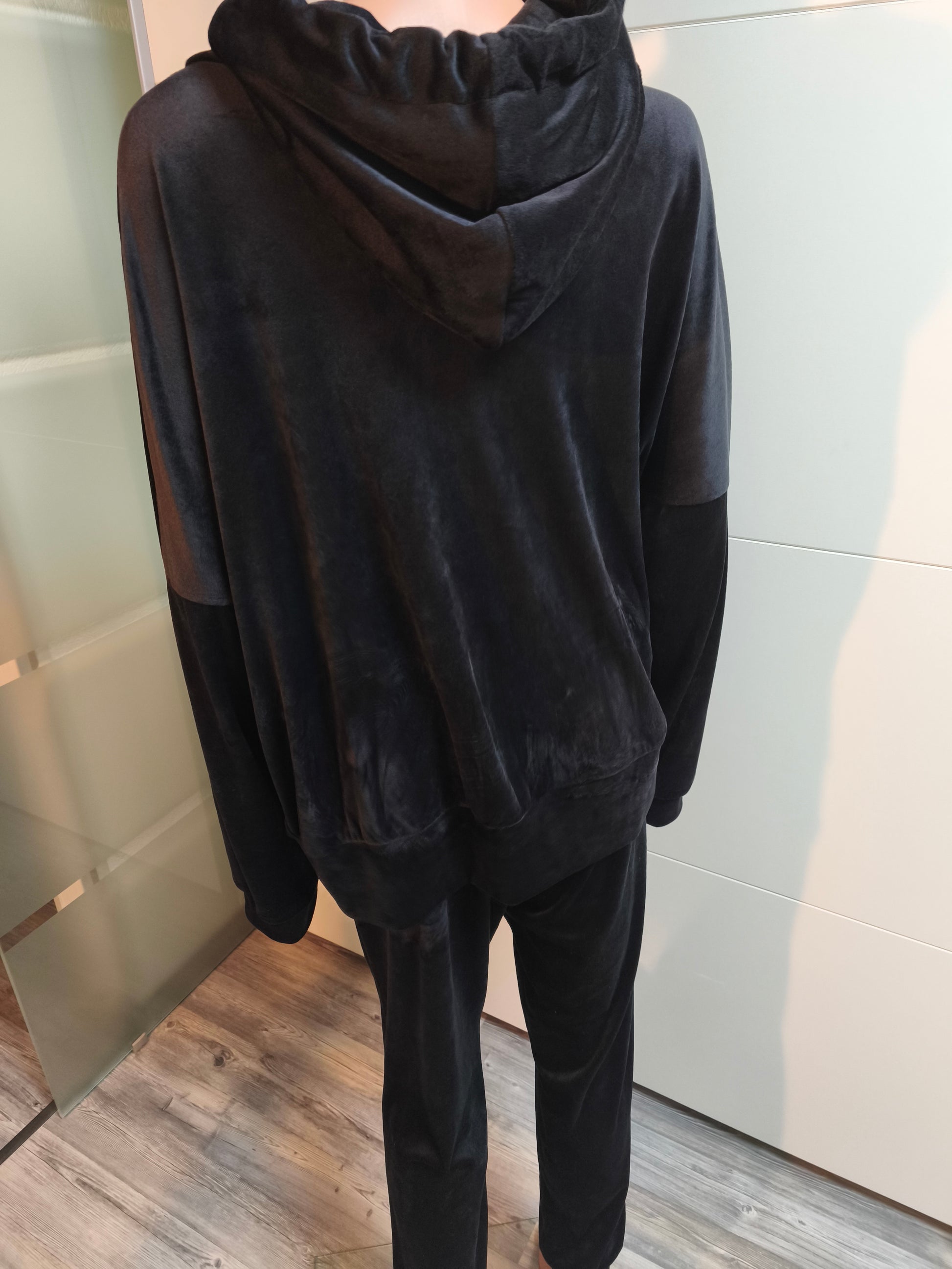 Der Anzug besteht aus einer Jacke mit Kapuze und seitlichen Taschen, vorn wird die Jacke mit einen Reißverschluss geöffnet und auf Brusthöhe ist das Logo der Marke aufgenäht.