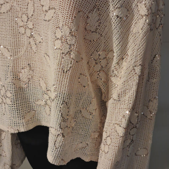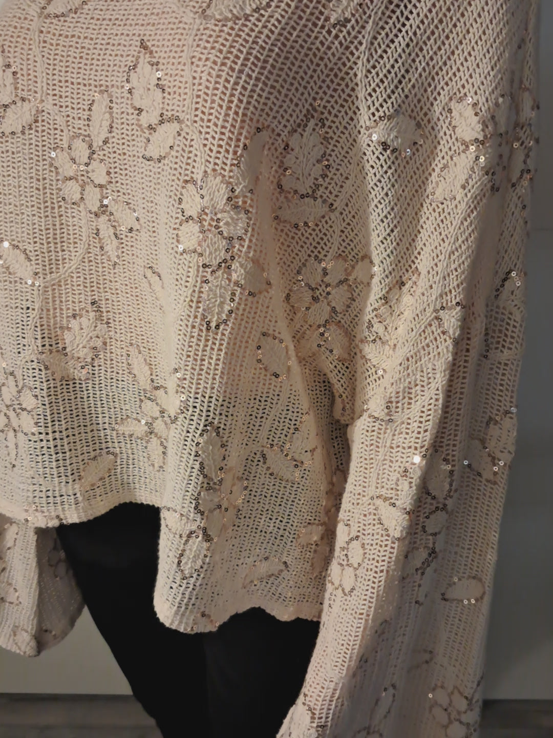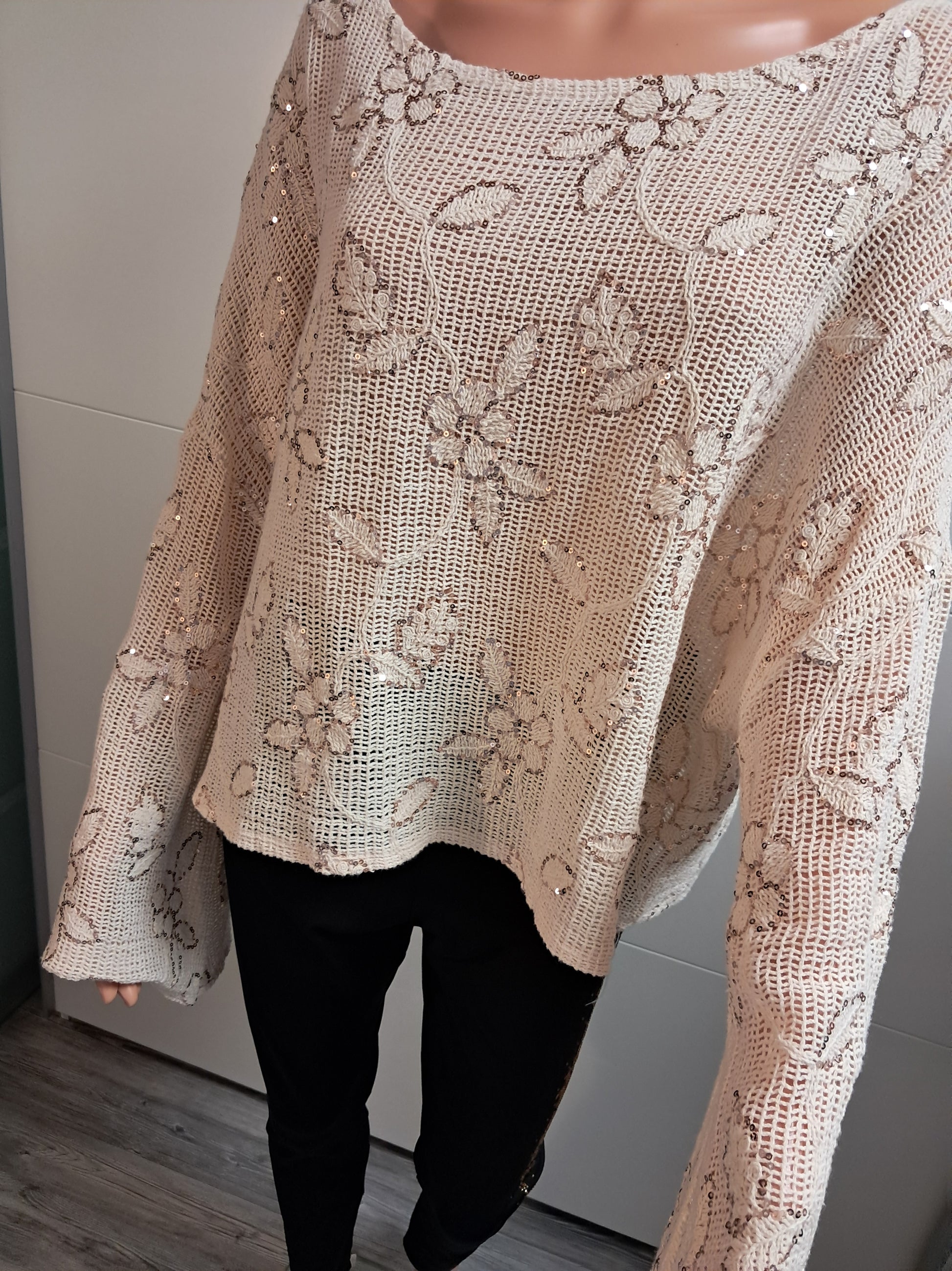 Hier habe ich noch ein Netz Sweatshirt mit ausgestellten Ärmel und weiten Sitz, wird locker über die Schulter getragen. Die Blumen und Blätter sind mit Pailletten umnäht, schaut Euch dazu mein Video an.