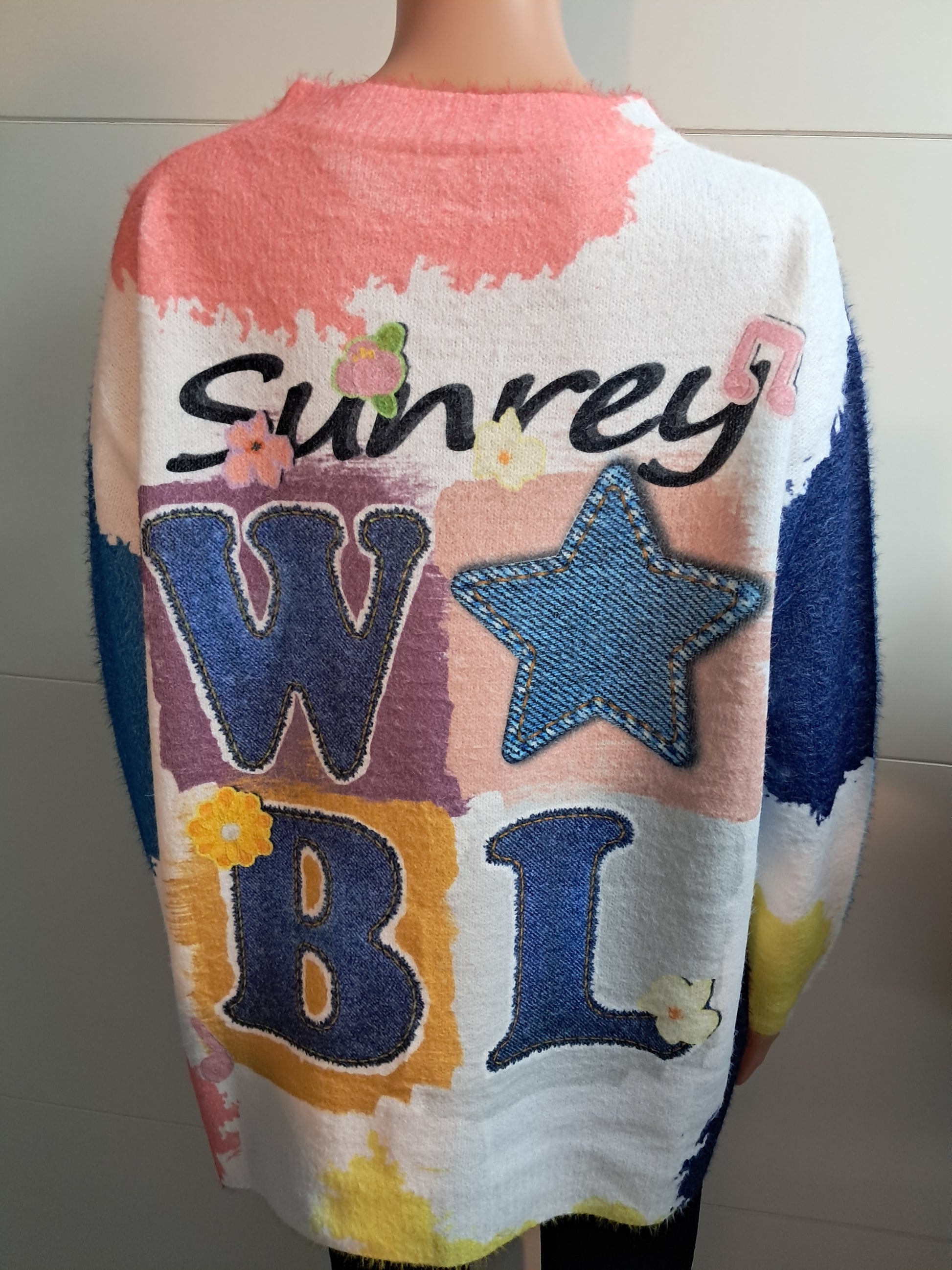 Sehr schöner weicher Strick Pullover mit Motiv rund um den gesamten Pullover, vorn ist ein Mädchen abgebildet was mit Strasssteinen besetzt ist.