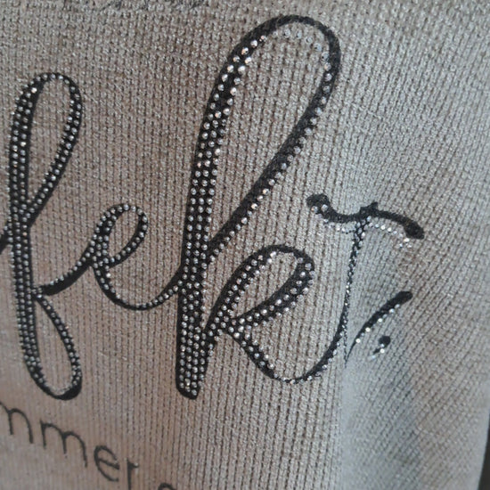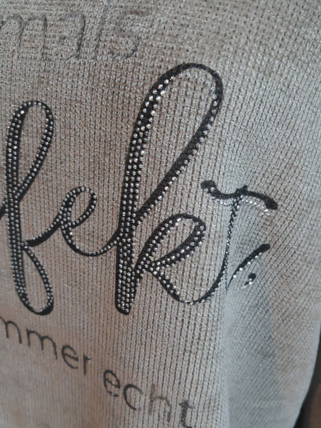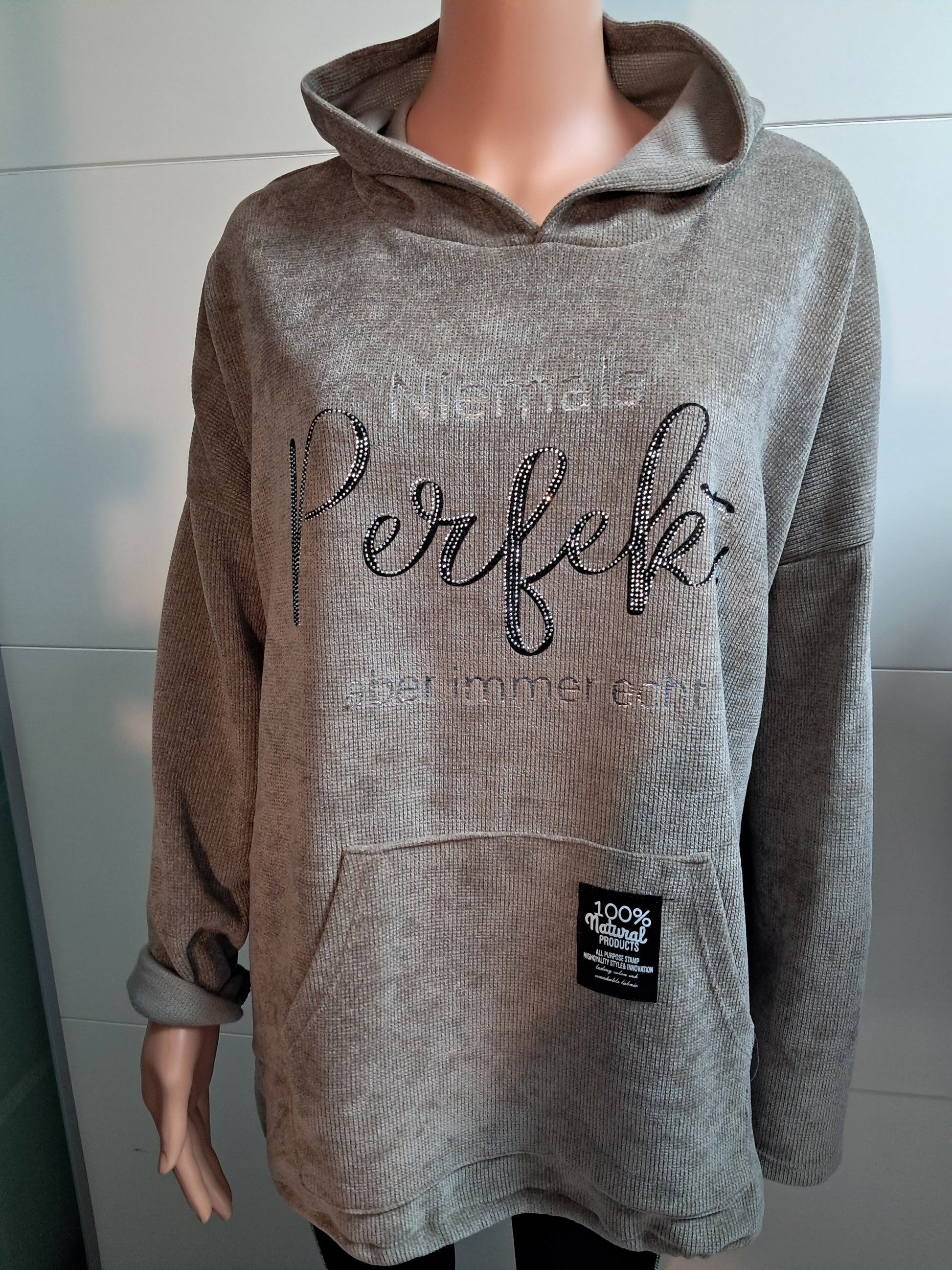 Sehr weiche Cord Pullover, vorn kürzer und hinten länger geschnitten. Hinten kann man den Pullover binden und vorn hat er Einstiegtaschen. Der Pullover hat ein tollen Spruch vorn , welcher über mit Strasssteinen besetzt wurde.