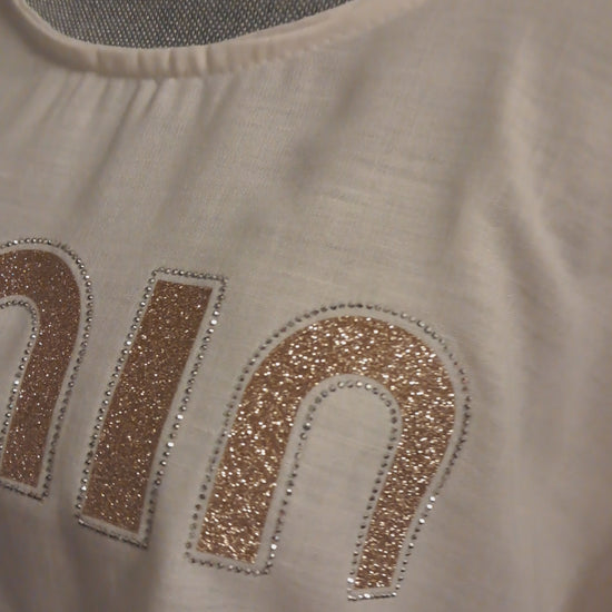 Zauberhaft schönes T-Shirt , Material ist wie Leinen und hat vorn ein Druck aus Gold mit silbernen Strasssteinen.