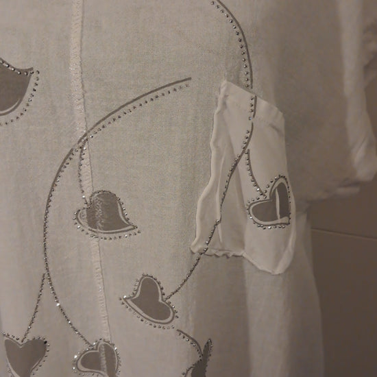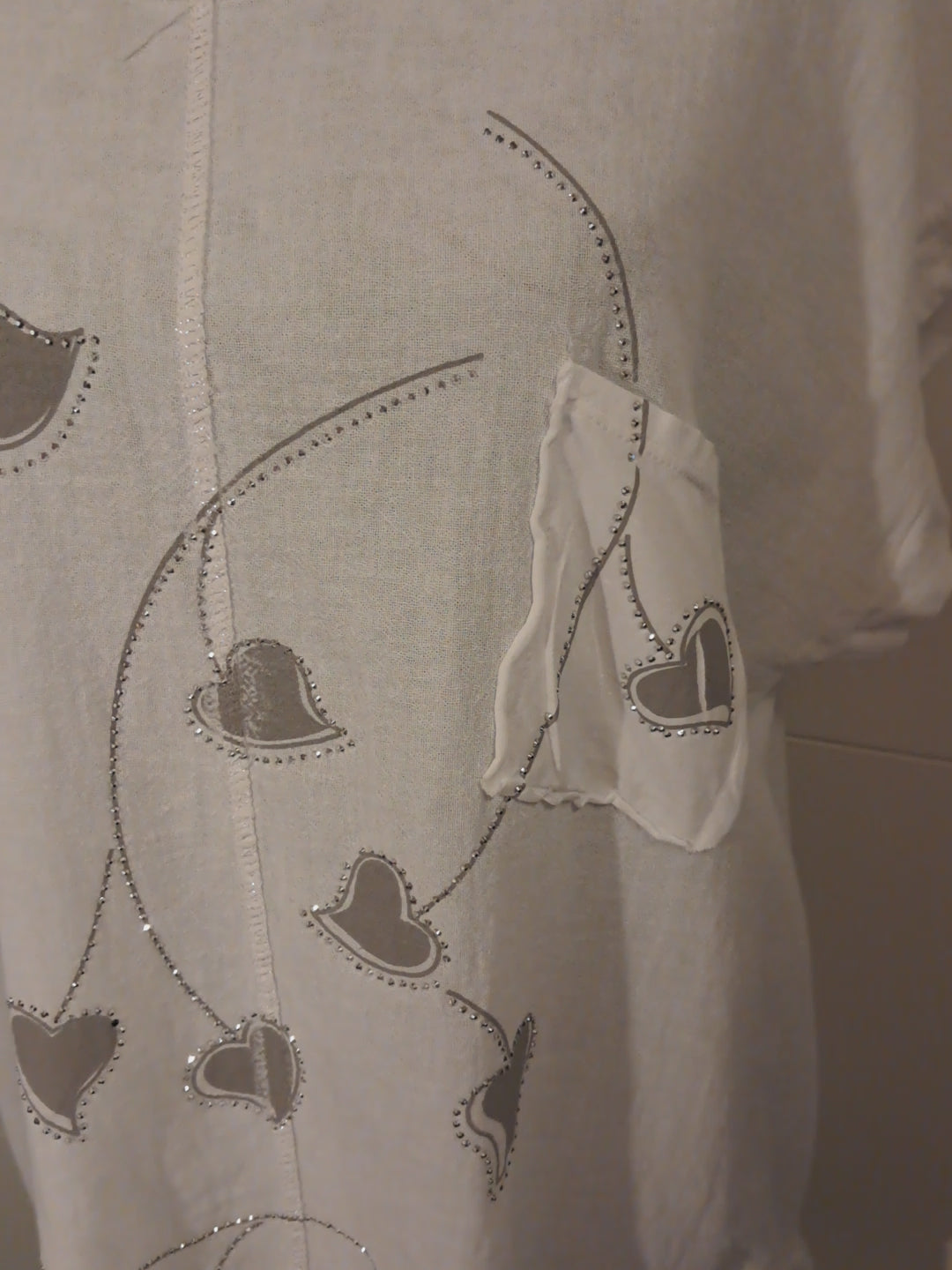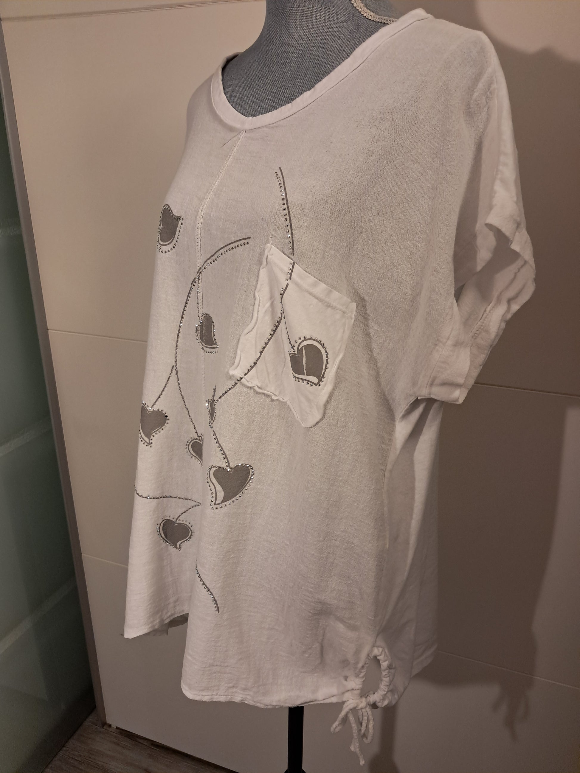 T-Shirt aus 60% Baumwolle und 35% Leinen . Vorn hat das Shirt eine Brusttasche und ein Druck , welcher mit vielen silbernen Strasssteinen umrandet ist. Seitlich kann man das T-Shirt binden. Hinten ist das Shirt länger als vorn.