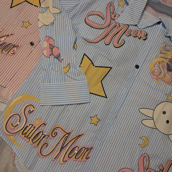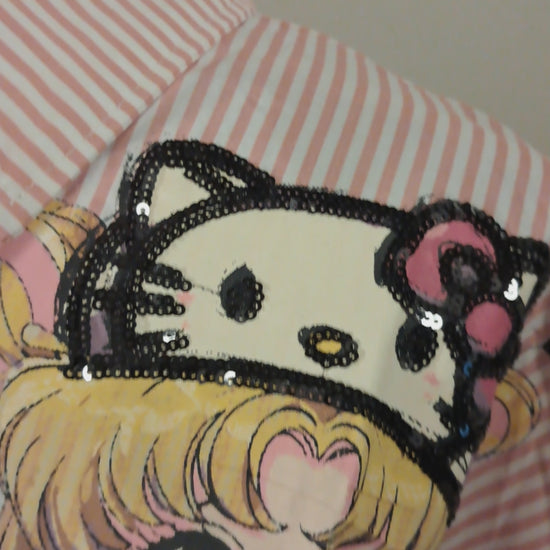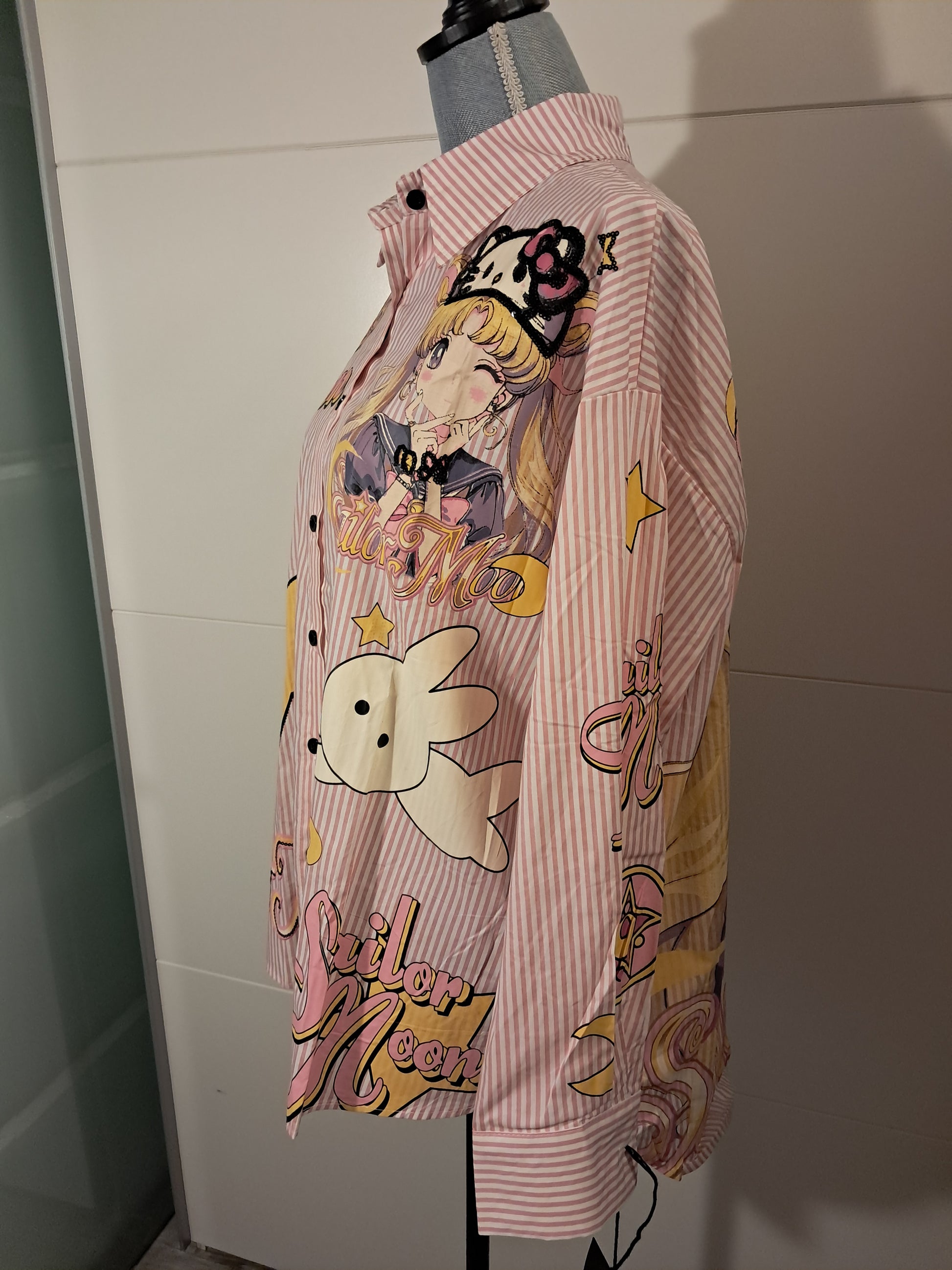 Traumhaft schönes Hemd mit Druck von Sailor Moon und Hello Kitty und teilweise mit Pailetten verarbeitet. Ein Designer Hemd.