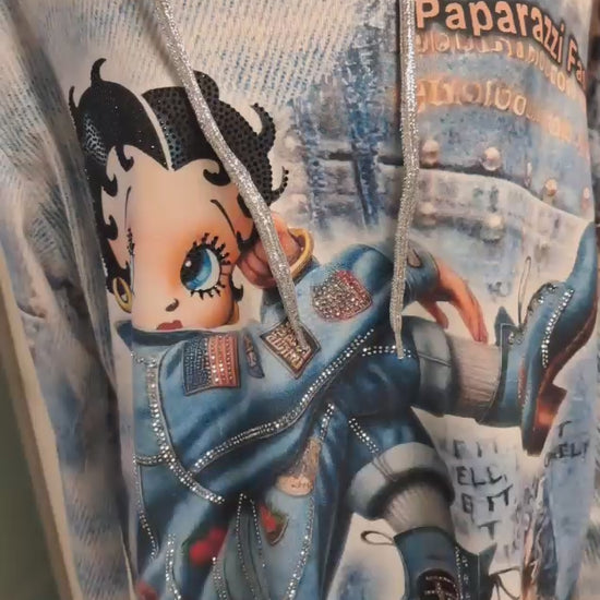 Wunderschönes Feinstrick Pullover von der Marke Paparazzi , mit Kapuze und Zugband und einen tollen Druck , vorn z.b. Betty Boop , vorn mit vielen Strassteinen besetzt .