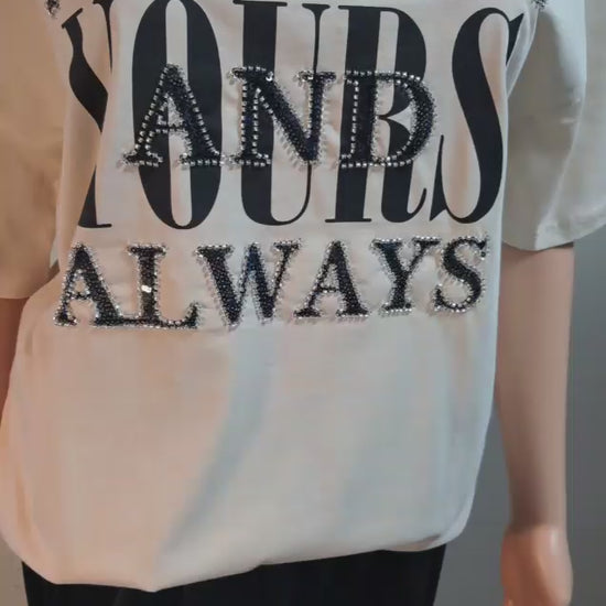 Schönes schlichtes Shirt , mit Druck vorn , besetzt mit Pailletten und Perlen.